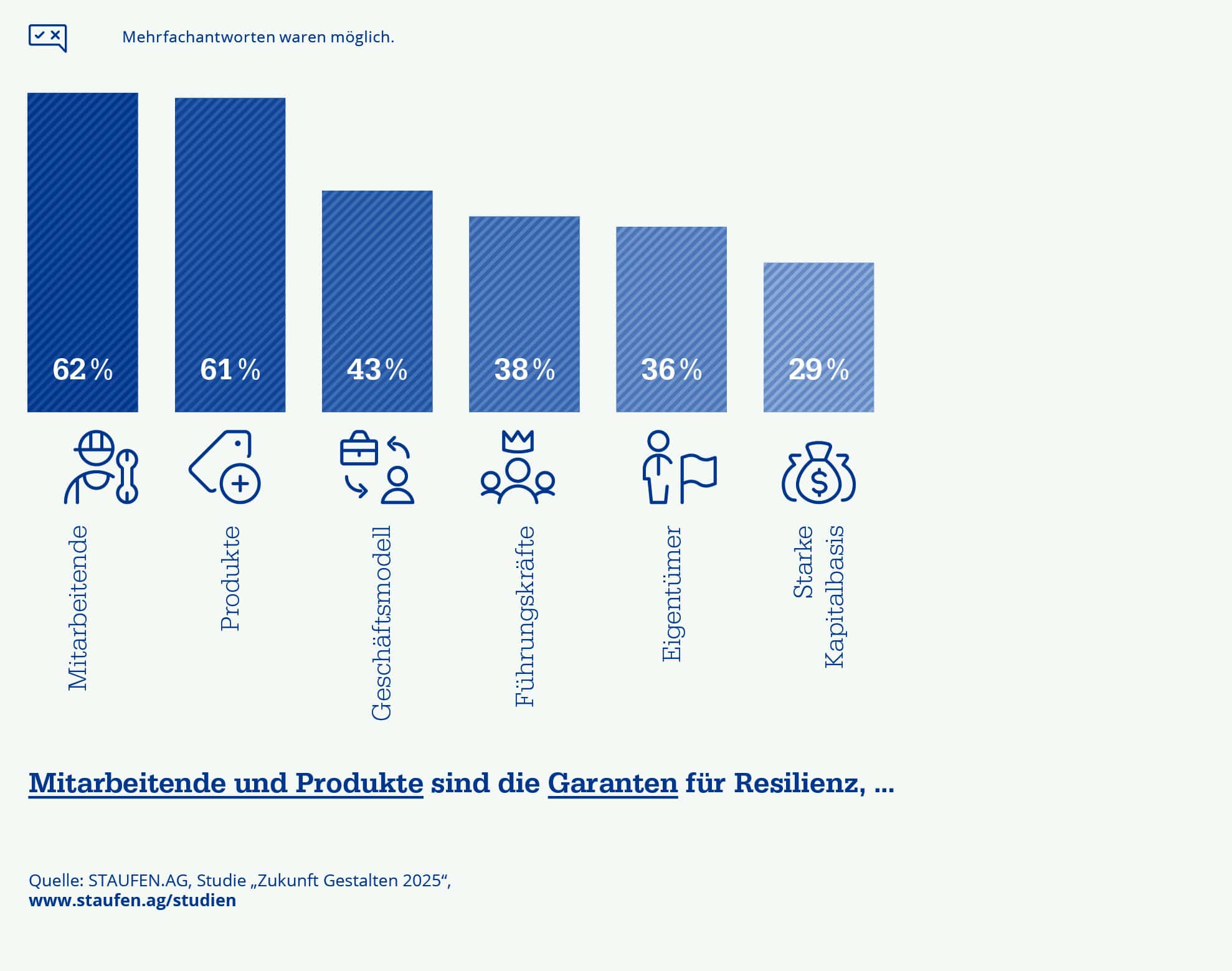 Auf die Frage, was ihr Unternehmen stark und widerstandsfähig macht, antworteten 62 Prozent der Befragten: die Mitarbeitenden. Die Produkte folgen mit 61 Prozent knapp dahinter, während das Geschäftsmodell (43 %), Führungskräfte (38 %) und Eigentümer (36 %) deutlich seltener genannt wurden. Goschy ergänzt: „Die Stärke eines Betriebs wird nicht nur durch Maschinen und Strategien, sondern vor allem durch die Menschen dahinter bestimmt.“